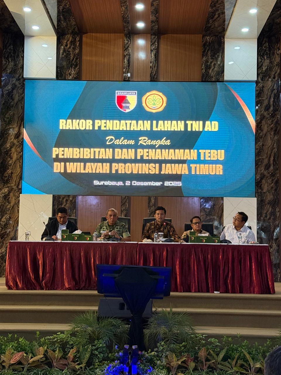 Kegiatan diawali dengan kunjungan kerja Direktur Hilirisasi Hasil Perkebunan, Ditjen Perkebunan, Kuntoro Boga Andri, bersama Tenaga Ahli Menteri Pertanian Brigjen Arif Hendro Jatmiko, beserta Direktur Utama PT SGN Mahmudi ke Markas Komando Lantamal V Surabaya, Rabu (26/11/2025). Kunjungan ini bertujuan mengoptimalkan pemanfaatan lahan TNI AL untuk pengembangan tebu melalui program bongkar ratoon dan hilirisasi tebu. Pertemuan tersebut diterima langsung oleh jajaran pimpinan Kodaeral V, di antaranya Laksda TNI Ali Triswanto, Brigjen TNI (Mar) Suwandi, serta jajaran perwira staf.